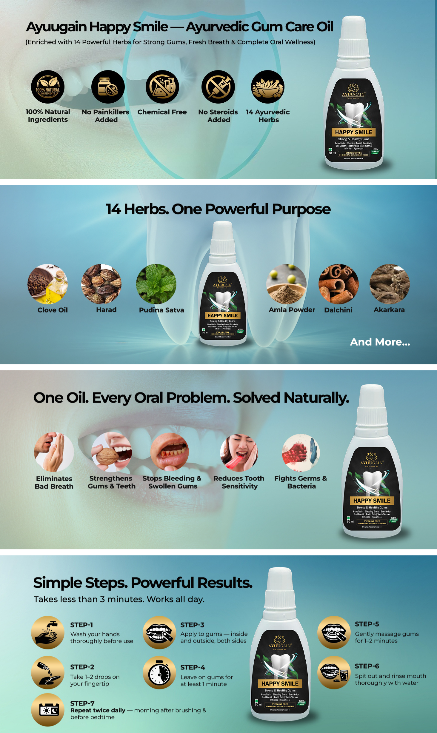 - Happy Smile – Ayurvedic Gum Care Oil helps to protect from germs, bleeding & swollen gums and toothache.